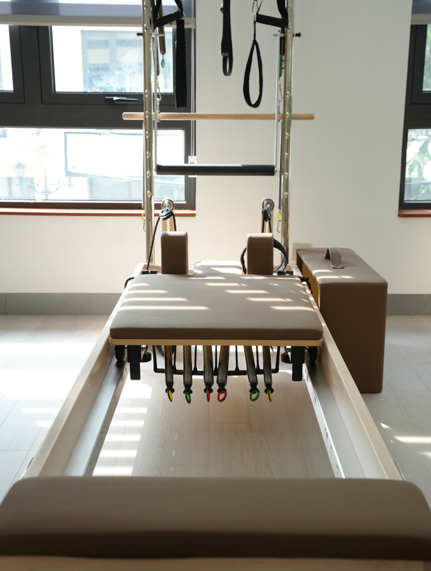 Máy Reformer Pilates được thiết kế tinh tế với cấu trúc gồm một mặt giường trượt (carriage) di chuyển dọc theo khung máy, hệ thống lò xo tạo kháng lực có thể điều chỉnh nhẹ hoặc nặng tùy theo mục tiêu tập luyện, cùng thanh đẩy chân (footbar), dây kéo và quai đeo hỗ trợ linh hoạt cho các chuyển động. Khi tập, người sử dụng có thể nằm, ngồi, quỳ hoặc đứng để thực hiện các động tác kéo, đẩy, giữ thăng bằng trên mặt giường trượt, trong khi lực đàn hồi từ lò xo giúp cơ thể vận động có kiểm soát, kích hoạt sâu nhóm cơ trung tâm (core), tăng sức mạnh, độ dẻo dai và khả năng phối hợp toàn thân. Chính sự kết hợp giữa chuyển động trượt nhẹ nhàng và lực kháng thông minh này khiến Reformer trở thành công cụ giúp cơ thể vừa thư giãn, vừa rèn luyện hiệu quả mà không gây áp lực lên khớp.